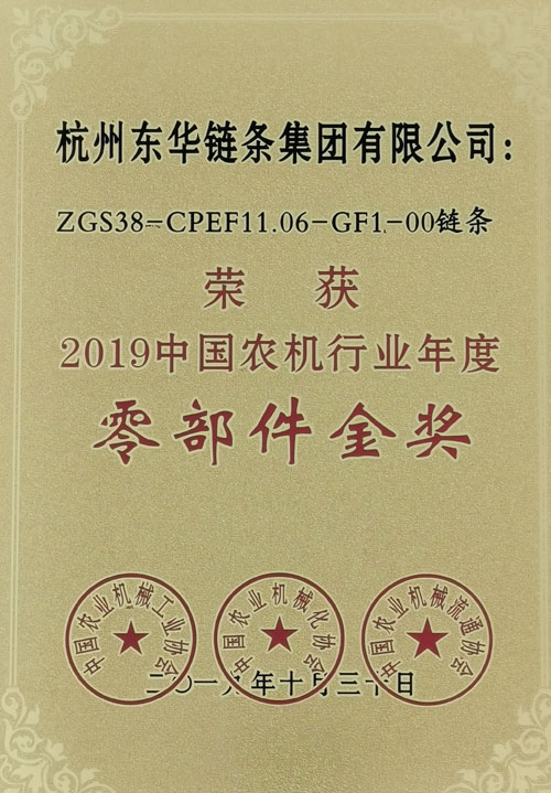 展會期間,舉行了2019中國農(nóng)機行業(yè)年度頒獎典禮,東華生產(chǎn)的ZGS38-CPEF11.06-GF1玉米收獲機用鏈條榮獲“2019中國農(nóng)機行業(yè)年度零部件金獎”,是鏈條行業(yè)唯一獲此殊榮的產(chǎn)品,是中國農(nóng)機行業(yè)的最高榮譽。該產(chǎn)品具有結構新,用途巧等特點,是東華近年來研發(fā)的高端鏈條產(chǎn)品。