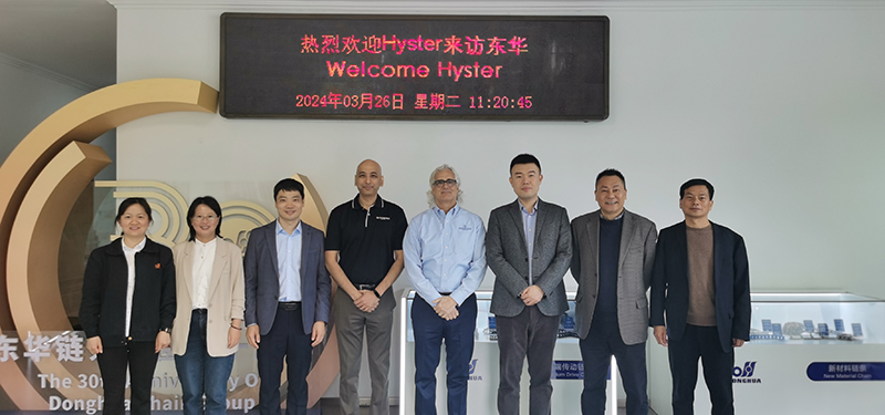 3月26日,Hyster全球供應鏈副總裁Mark攜亞太區供應總監Muquarram、Hyster富陽工廠采購總監到訪東華,集團董事長宣成攜國際市場部總經理張秉忠、板式鏈事業部總經理李奎林等接待。
