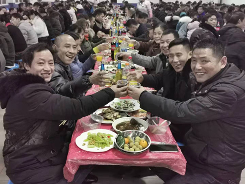 每年春節都有因各種原因不能回家過年的外地員工留守,公司每年組織留守員工“同吃年夜飯,歡度除夕夜”。119日晚上,300多名天南海北的員工提前同舉酒杯,同吃水餃,共同祝福,明天會更好!工會主席魯小林、工會副主席劉冬根等領導現場向員工敬酒,表達了對大家的祝福,同時向參與員工發放了新年紅包。參與員工一邊同吃年夜飯,一邊上臺唱歌、跳舞,把活動推向高潮。