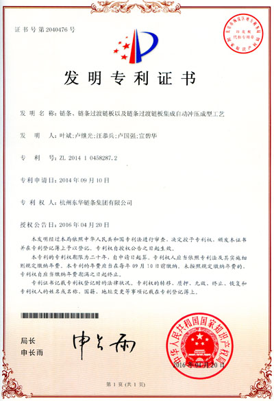 多年來,東華集團以每天研發兩至三個新品種的研發能力一直成為中國鏈傳動行業標桿企業的標志,尤其是每年獲得的專利都取得很好的社會效益和經濟效益。如今年獲得的六件發明專利中:一種無聲鏈多顆落料光亮沖裁復合模,該發明實現了高速大批量生產表面及內孔光亮的無聲鏈鏈板,避免了級進模上采用擠光方式獲得光亮帶導致的原材料浪費,同時這種模具結構對機床精度和送料機構要求不高,降低了設備折舊成本;如鏈條、鏈條過渡鏈板以及鏈條過渡鏈板集成自動沖壓成型工藝,本發明的目的在于克服現有技術中存在的不足,而提供一種鏈條、鏈條過渡鏈板以及鏈條過渡鏈板集成自動沖壓成型工藝,通過把多個加工過程集成,用一臺沖制設備代替傳統的沖制設備、退火設備和壓彎設備,提高效率,大大減少了加工設備和人工,降低了生產能耗,大大縮短了產品加工流程,顯著提高了過渡鏈板生產時的安全性。